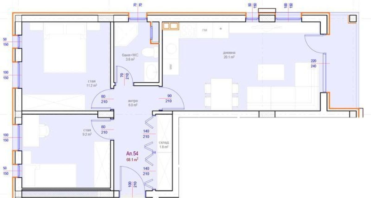 Разпределение : хол с кухненски бокс, две спални, склад, баня с тоалетна и балкон. Изгодни цени за качествено и модерно ново строителство в район с отлично развита инфраструктура, в близост до 'Мега Мол' и фитнес 'Пулс'. С възможност за закупуване на паркомясто.